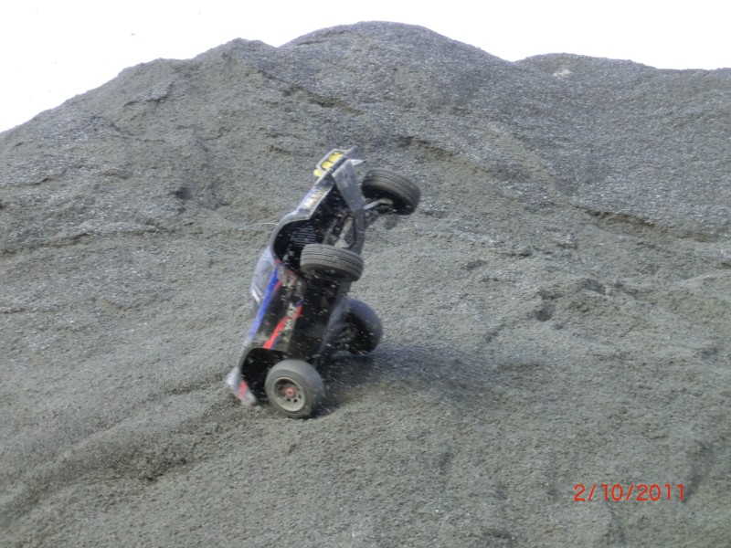 Så lenge grusen var nokon lunde hard hadde eg ingen peoblem å køyre rett opp sandhaugane utan noko særleg gass. Men etterkvart som padledekkene på bajane gravde opp grusen og det vart mjukare vart det verre utan at det vart noko problem av den grunn.. Problemet var nok at bilen fikk litt for mykje vekt på bakhjula som førte til at frammdekkene løfta seg, fikk mindre kontakt med grusen, blei til pizzahjul som då igjen førte til at kreftene i bilen forsvann i hjulspinn :p stressballen meinte at ein tjukkare diffolje i midtdiffen kanskje kunne gjøre susen, så kanskje eg må skru litt til neste gang ;)