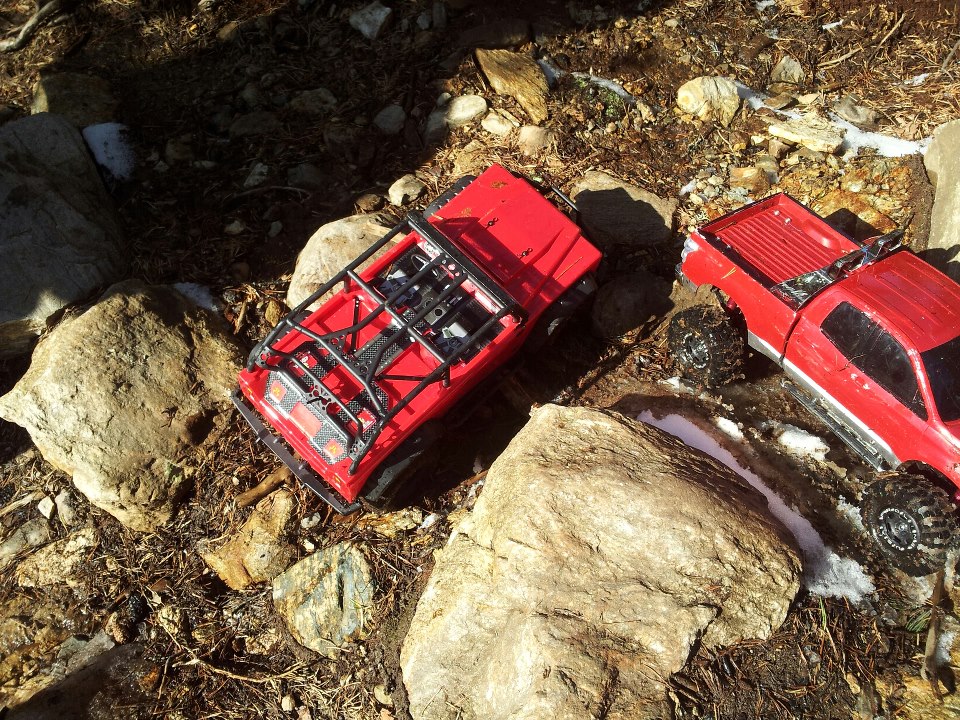 Siden det kom nysnø i natt passet det (ikke) ypperlig å prøve seg på åsen med trail biler i dag. Servoen i XR10en min er mer eller mindre søppel så jeg fikk låne Samty sin SCX10.