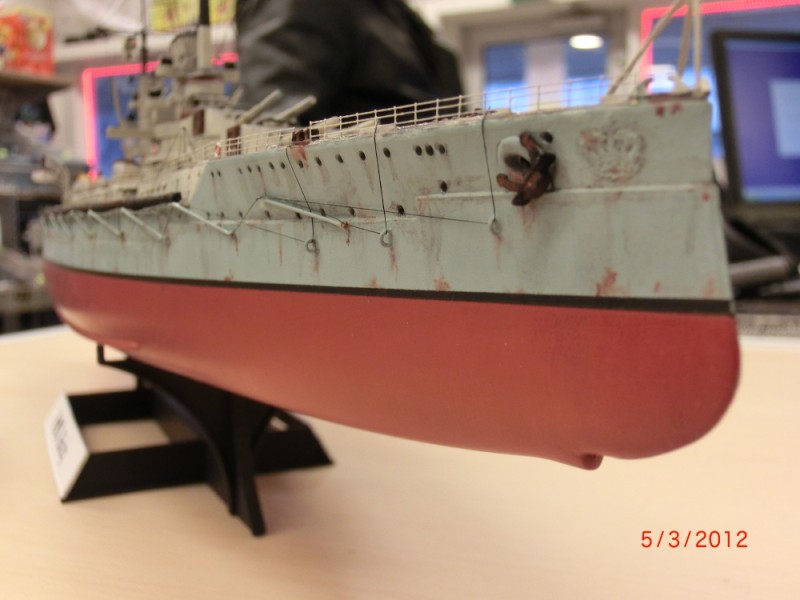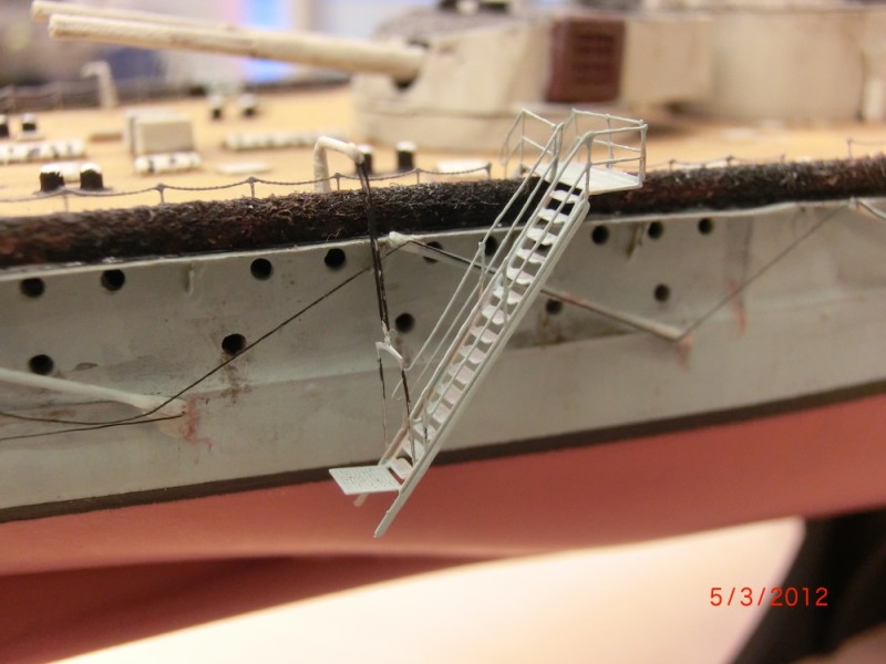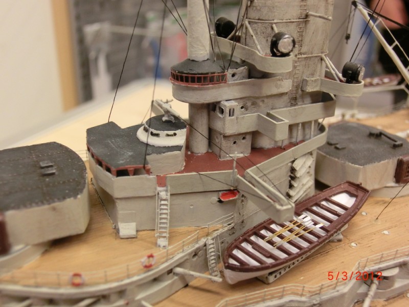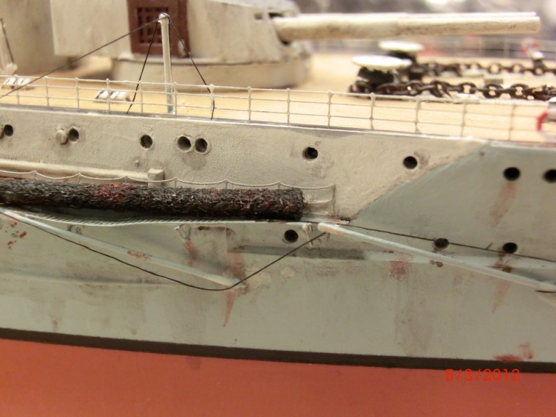 Bilder av modellen: (legg spesielt merke til små detaljer som hengetrappen, rekkverk, væringseffektene, riggingen, årene i robåtene og annet småtteri. På et av bildene har jeg satt en deansplugg frem for sammenligning)