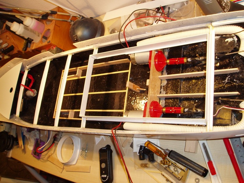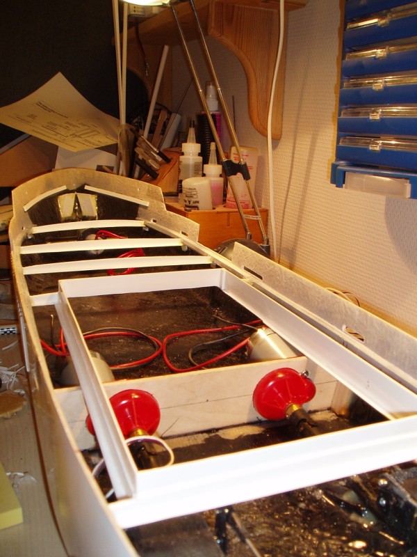 Jeg liker dårlig å få nye ideer til båten når det nærmer seg treff på storevannet. Det er nesten typisk at jeg gir meg selv mer arbeid på denne måten, og dessverre blir det som regel vanskelig å la ideene få være i fred. Det blir iallefall viktig nå å få sakene på plass så fort som mulig, og jeg har veldig lyst til å få tatt en ny flytetest i helga siden jeg har forandret så mye innvendig siden sist båten var på vannet.