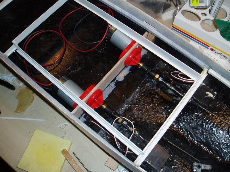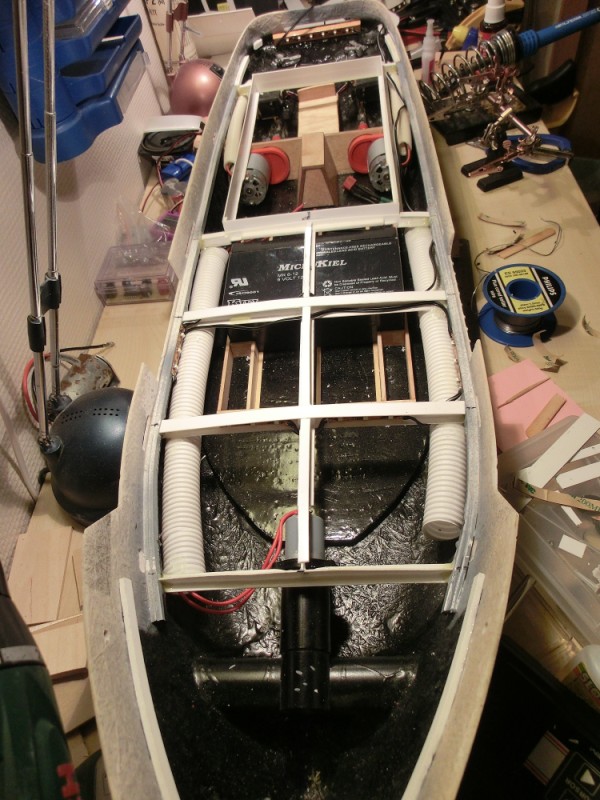 Ikveld fikk jeg tilpasset motorfestet, og dette er nå klart for liming. Etter tilpassing tok jeg bort motorene igjen, og waterproofet treverket. Det tar noen timer ekstra å fullføre motorfestet grunnet lang tørketid på epoxyen jeg bruker, men det vil lønne seg i lengden. Jeg har også valgt å gå for plassering av elektronikk og løsninger som skjuler det meste av ledninger, men som samtidig enkelt plukkes frem om nødvendig. Dette gir et mer ryddig og oversiktlig rom i båten.