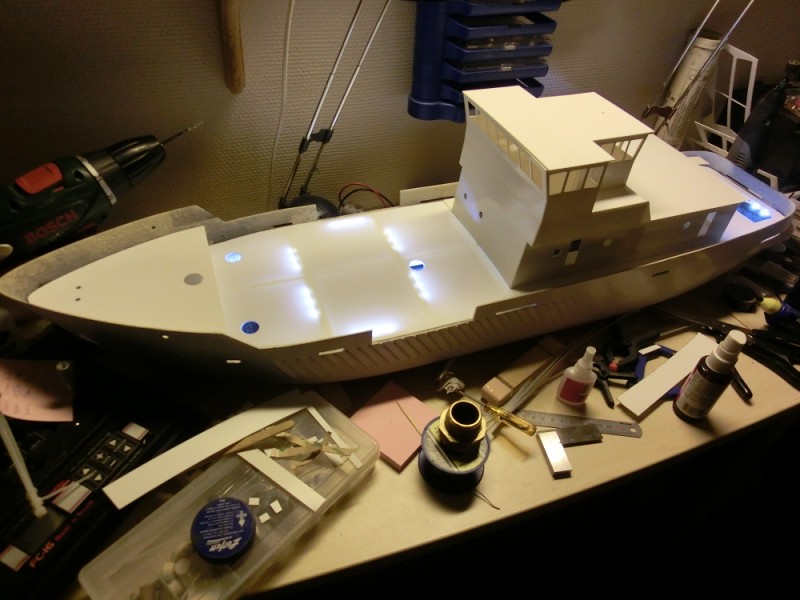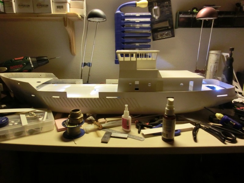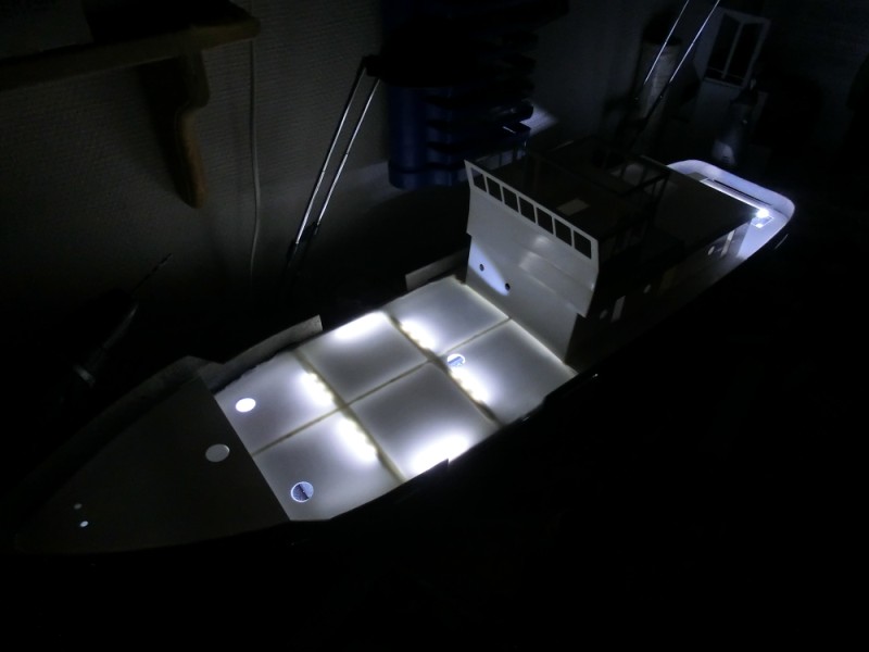 LED remser er nå kommet på plass, og jeg har stort sett bare brydd meg om å legge inn lys der jeg absolutt ikke vil komme til i ettertid. Innsiden av skroget er svart, så det absorberer mye lys. Tror jeg har brukt 30 LEDs (ca 0.5 meter LEDremse) eller deromkring.