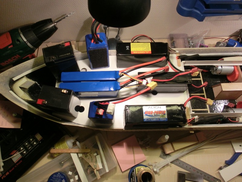 Jeg prøver først å plassere de faste tingene som det er minst sannsynlig blir flyttet på. Da tenker jeg på batteri og motorer. Det meste annet kan faktisk flyttes på i ettertid. Om jeg f.eks finner ut at høyttaleren gir for dårlig lyd der den er plassert nå, så har jeg allerede tatt høyde for at det skal være enkelt å endre den plasseringen, med kabler og alt. Det sammen gjelder kabler, regulatorer, servoer og annen elektronikk. På denne måten slipper jeg at enheter blir stående permanent i båten om det skulle vise seg i ettertid at plasseringen var dårlig. Det er også viktig i tilfelle en komponent ryker.
