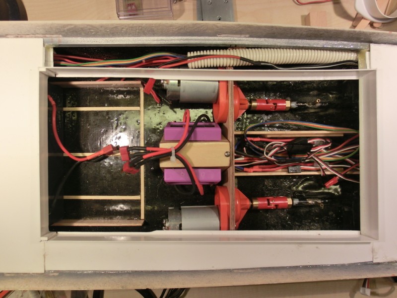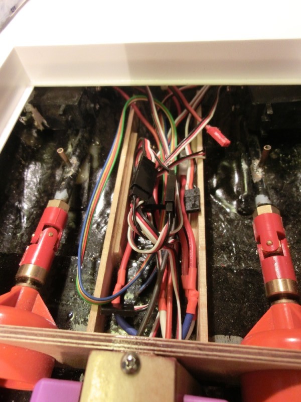 Ikke så mye som ble gjort på båten idag dessverre, et jobboppdrag har tatt mye av tiden i kveld. Har dremlet noen hull her og der slik at jeg fikk plassere ledningene fra fartsregulatorene, og jeg har også tenkt litt på hva jeg skal gjøre med ledningene til mottaker. Mottaker skal ligge synlig, for lett adgang til krystall, og kanskje mest viktig, for visuell sjekk av f.eks fuktighetsproblemer.