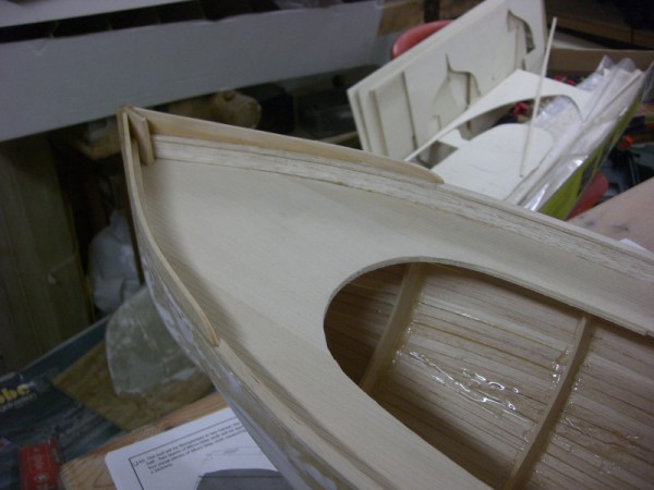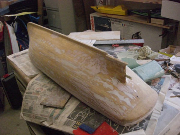 Hadde ei god økt i dag, og fikk planka ferdig skroget. Det blei en del lapping, men det gikk egentlig veldig greit. No får limen herde litt, og så tenkte eg å lime på innsida med epoxylim, etter råd fra Stressen. Så blir det pussing og evt sparkling.
