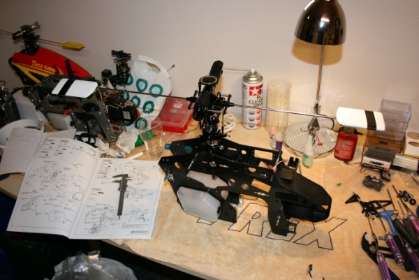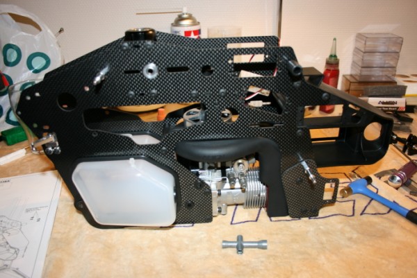 Siste bildet viser hvor langt jeg kom i kveld før det var på tide å gi seg. Motor er montert, og servoer er festet. I morgen lager jeg sikkert til resten av linkene og halesystemet. Regner med å justere alt inn på fredags kveld, og da er det kanskje duket for oppstart i helgen :mrgreen: (hvis jeg får hovedbladene til da...)