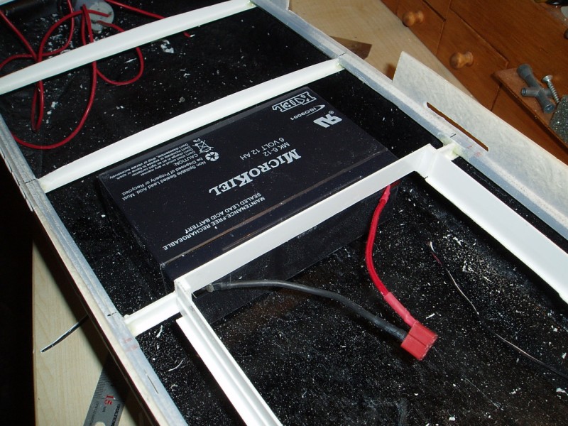 Jeg måtte tilpasse den ene dekksbjelken litt for å få batteriet slik jeg ville, men da ligger det iallefall godt plassert, og slik at jeg får det ut igjen om jeg må.