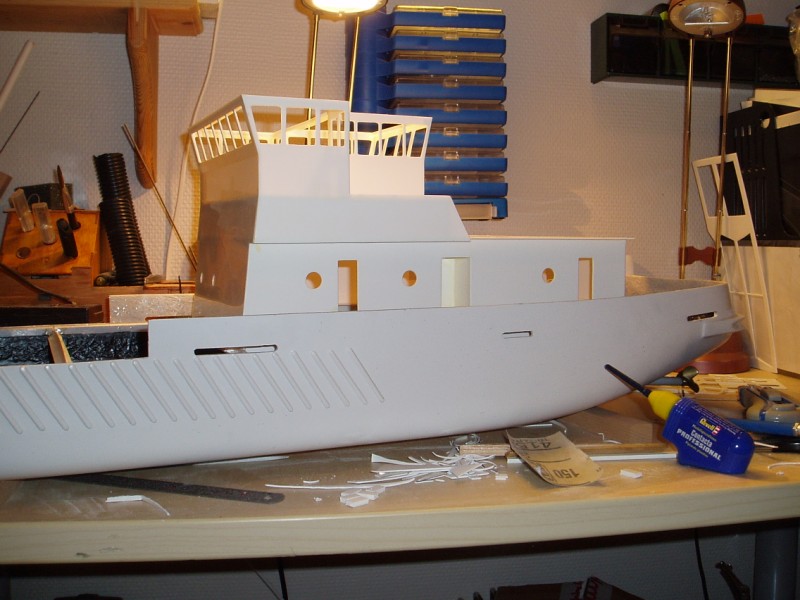 Fikk dillet en times tid med båten ikveld, og har nå stort sett fått ferdig støttene til dekket rundt hele båten. Madammen fant 1:1 tegningene av modellen, disse har vært bortlagt ganske lenge, men nå er de heldigvis kommet til rette igjen. Når jeg studerte dem litt, så fant jeg ut at jeg hadde utelatt å lage et hull i akterdelen av skroget, så nå er dette også gjort.