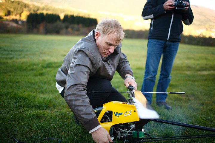 Har nettopp starta med helikopter, og er på mitt 10. batteri på ein T-Rex 500CF. Har så vidt tatt steget vidare frå stabil hovring, og pulsen stig nokså raskt når halen ikkje lengre skal stå rett mot meg! Men hittil har det gått fint, simulatortrening gir stor effekt! (Hovra nose-in på 5.batteriet). Har forøvrig hytte på Kråkeneset (sørsida av Førdefjorden, rett overfor Naustdal), så det kan godt hende eg tek meg ein tur innom Skaflestad ei helg.