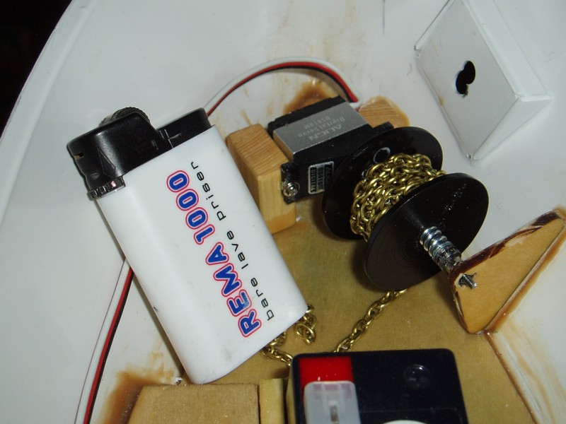 Jeg har nå funnet frem en Align DS410M servo fra et fly som ikke blir bygget på en stund, og gikk såvidt igang med å lage til en trommel som ankerkjettingen skal festes på. Servoen skal modifiseres til ankervinsj, og trommelen blir festet direkte på servoen. Jeg har laget til et slags slipperclutch-system på trommelen, slik at den slurer hvis kjettingen blir dratt inn for langt. Dette ble lettere enn å lage til et automatisk stopp-system.