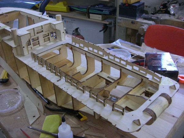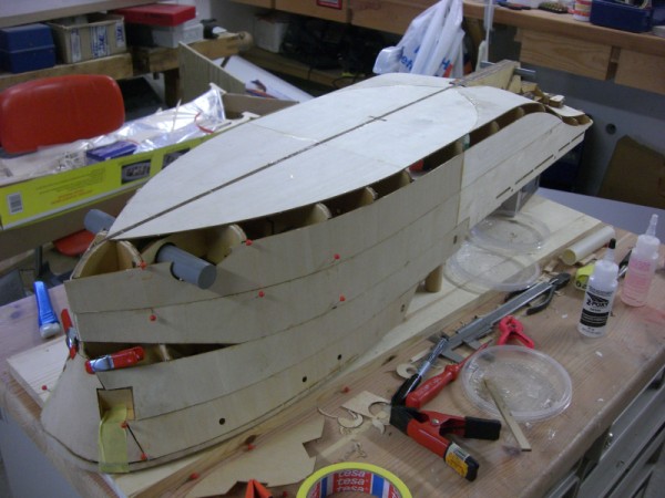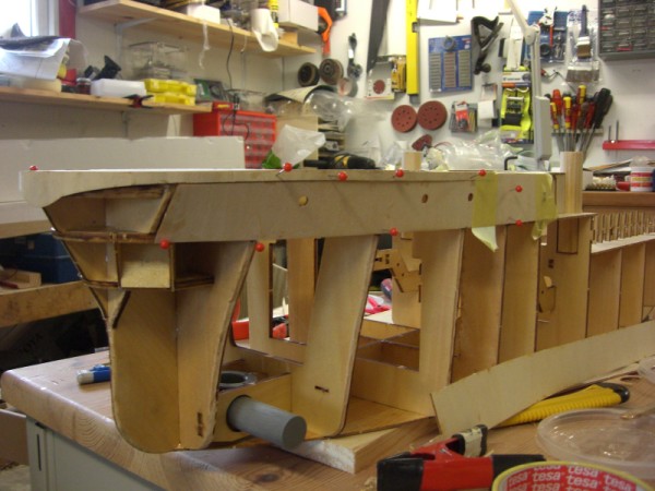 Dei hola som no er igjen skal plankast med 2x3 og 2x6mm lister. Satsar på å ha skroget ferdig til sparkling og pussing i løpet av nokre dagar. Det er virkelig veldig god passform på dei laserutskorne delane. Kvir meg litt til akterdekket, somskal plankast med "en million" korte lister......