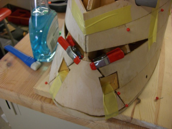 Da var det på tide med ei lita oppdatering. Har fått limt fast begge thrustarane, samt bunnplater og har begynt på skutesider. Plater i baugen må varmast over kokande vatn for å bli mjuke nok til å ikkje brotne