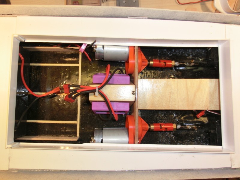 Ikke så mye som ble gjort på båten idag dessverre, et jobboppdrag har tatt mye av tiden i kveld. Har dremlet noen hull her og der slik at jeg fikk plassere ledningene fra fartsregulatorene, og jeg har også tenkt litt på hva jeg skal gjøre med ledningene til mottaker. Mottaker skal ligge synlig, for lett adgang til krystall, og kanskje mest viktig, for visuell sjekk av f.eks fuktighetsproblemer.