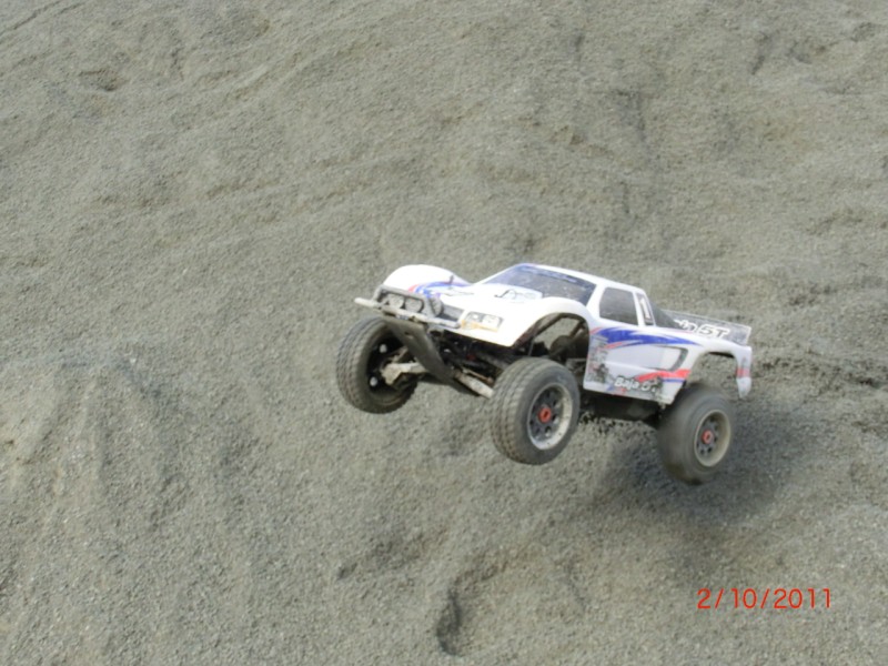 Dette var moro gitt. Rett og slett en skikkelig knall dag på nesjane, men det skyldes nok utelukkende bensinbilene. Utrolig moro å herje med bil, det er iallefall helt sikkert. Begynte med Baja 5T, og fikk vel kjørt i gode 25 minutter før jeg klarte å knekke opp en gammel skade. Ingen big deal, det var nedre del på bakre høyre støtdemper som gav etter, og denne var limt fra før. Kanskje på tide å bytte nå. Disse store bensinbilene skinner virkelig i store sandhauger, iallefall med paddledekk. De klatrer veldig godt. Å stå bak en slik bil er direkte dumt, da den kaster sand og stein mange meter. Nå må jeg gå over bilen med høyttrykkspyler og avfetting :mrgreen: