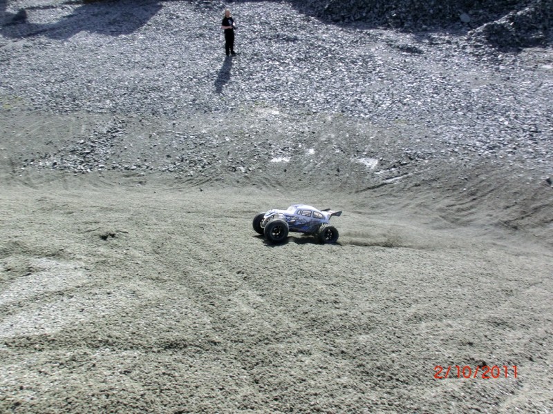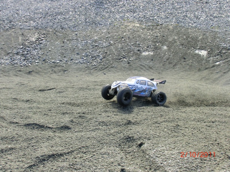 Så lenge grusen var nokon lunde hard hadde eg ingen peoblem å køyre rett opp sandhaugane utan noko særleg gass. Men etterkvart som padledekkene på bajane gravde opp grusen og det vart mjukare vart det verre utan at det vart noko problem av den grunn.. Problemet var nok at bilen fikk litt for mykje vekt på bakhjula som førte til at frammdekkene løfta seg, fikk mindre kontakt med grusen, blei til pizzahjul som då igjen førte til at kreftene i bilen forsvann i hjulspinn :p stressballen meinte at ein tjukkare diffolje i midtdiffen kanskje kunne gjøre susen, så kanskje eg må skru litt til neste gang ;)