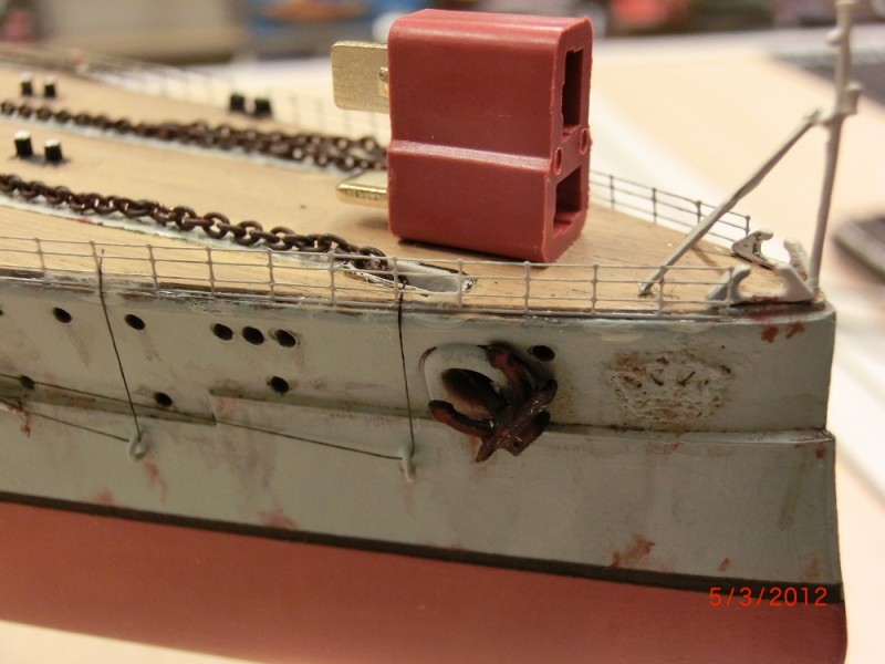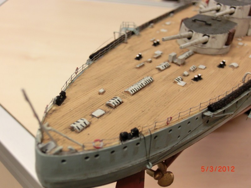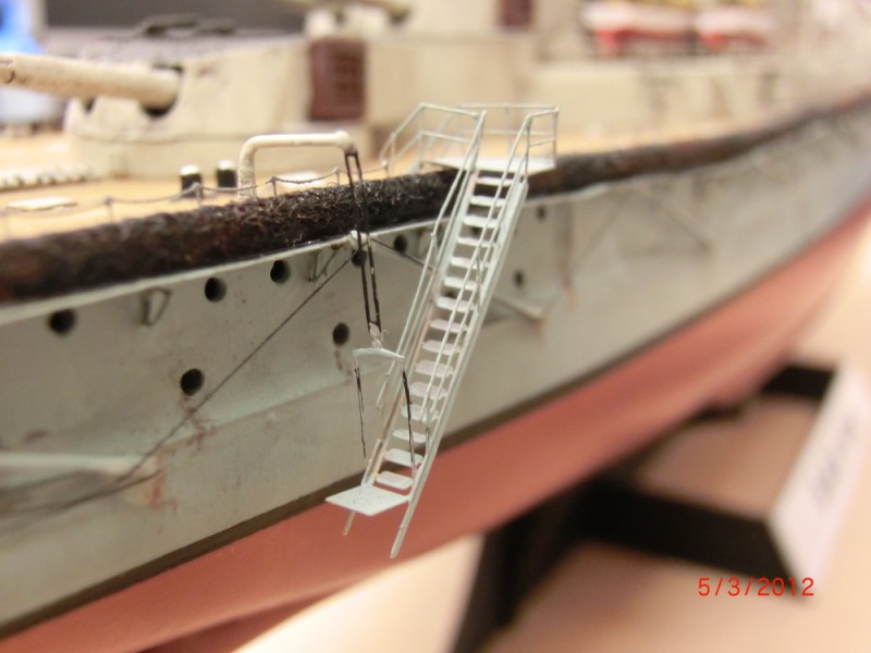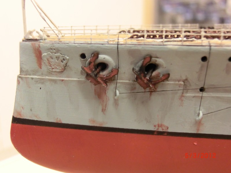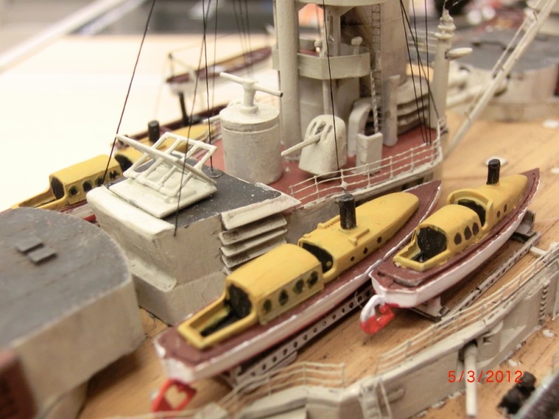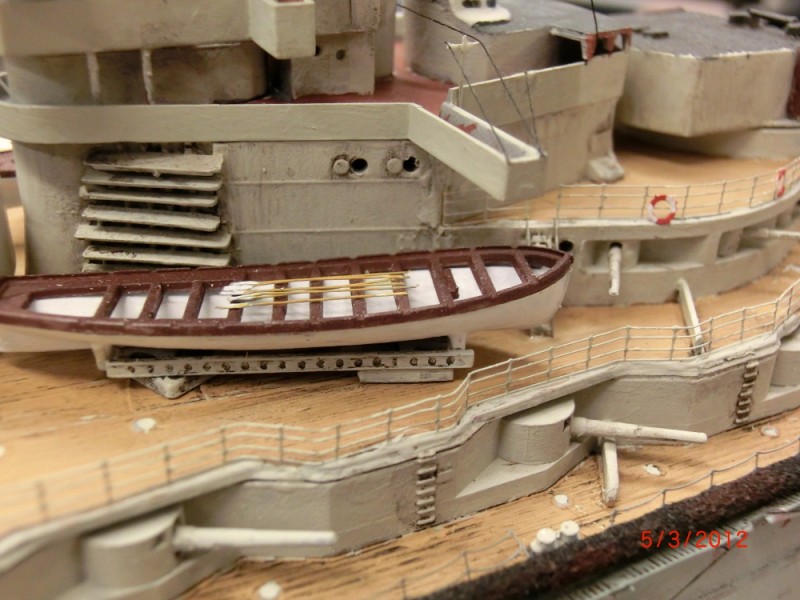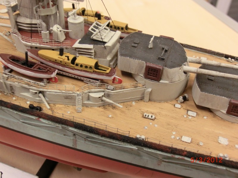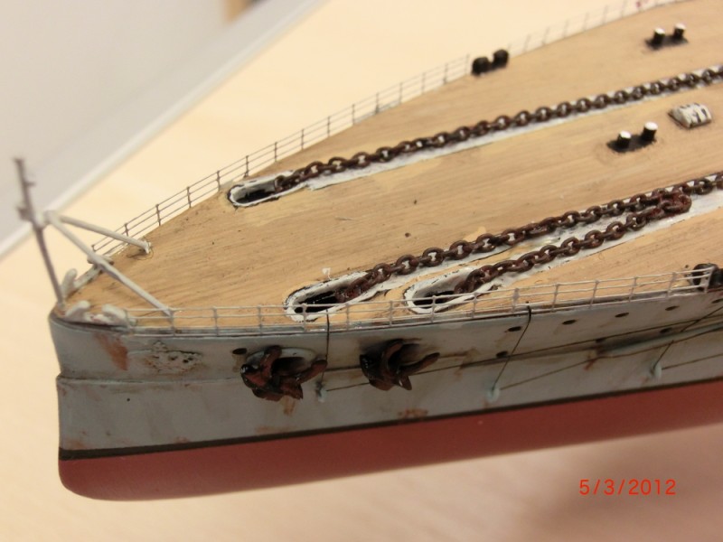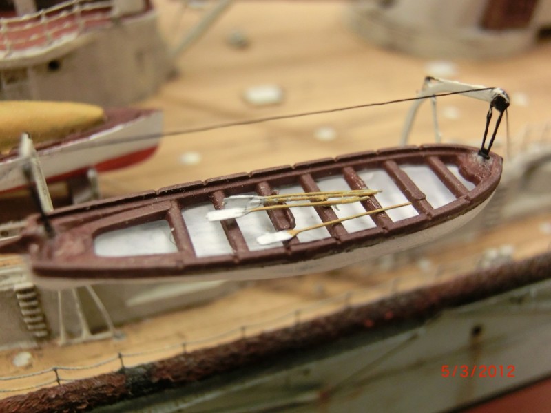 Bilder av modellen: (legg spesielt merke til små detaljer som hengetrappen, rekkverk, væringseffektene, riggingen, årene i robåtene og annet småtteri. På et av bildene har jeg satt en deansplugg frem for sammenligning)