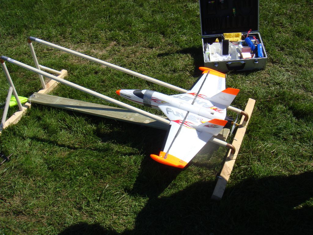 Ikveld la eg strikken dobbelt, og drog den til 6kg på fiskevekta. Skal si det vart fart i sakene. Nå går det an å kalle den ei utskytings rampe. Flyet er i lufta på1-2 sek. Ingen problem med å starte opp motoren etter 15.20 meter. vector! Nå MÅ du lage en krok på din fun jet, og ta turen. No flyr eg på Horstad flata. Ca en km etter tunnelen på veg mot Skaflestad. Faktisk den beste plassen eg har flydd på i min fly karriere. VELDIG åpent og STORE bøer. Eg kommer kun til å fly elektromodeller der, da det var der folk flydde før i tiden, men fekk ikke lov å fly med bensin da det vart klager på støy. Bror min og eg har vert der i fleire timer ikveld også. Men uansett. Nå er rampa akuratt som eg vil ha den. Trur kanskje eg kan dra opp F 18 med den også. Skal prøve i morgen. Vi flaug mye med easyglideren i kveld. Bror min har tatt flyginga like fort som meg, og eg er bittelitt stolt. Kjekt å sjå kor mykje han liker hobbyen. Så nå er det ikke bare musikk han driver med, ikke at det er en uting. Eg hadde bare oppe fun jetten en tur. Imorgen skal vi gjere det vi kan for å filme den og skyte den med radar. Skal sette opp en palle til sjold.hehe. Eg hadde noen lowpass, og fy faen. Må bare sjåast. Den er liten, og det gjer seff til at den forsvinner fort. Det er nysådd der stripa skal klippast, så det tar sikkert litt tid før den blir fin. Men gress våkser jo nesten alltid for fort, hehe, men i dette tilfelle er det jo faktisk bare bra. Vector! Ta med deg jetten en dag da? Så skal eg ta med meg båten til Florø en dag. Deal. Forresten. Eg dremla ett hol under jetten, og fylte det med epoxy, så stappa eg ett rorhorn nedi. Så dremla eg til rorhornet sånn at det har blitt en fin krok. Fungerer utmerket. Eg måtte jo lande på den nysådde bøen, men uten skader, og kroken er fortsatt på plass. Eg har jo også brukt noen karbon lister rundt på kroppen, og en mitt under. Så epoxyen sitter nok fast i den også. Kroken sitter iallefall noe inni h.... Var litt heldig med den stripa. Det er faren til beste kompisen til bror min som eiger bøen der. Og vi kan fly der så mye vi vil. Eg kommer nok til å bruke Skaflestad også, men no koser eg meg så mye på nye plassen at eg held meg på Horstadflata ei stund. Pluss det er jo ikke langt fra halve vegen for meg å kjøre. Det er vel det vi kan kalle en vinn vinn situasjon.hehe :D Eg skal legge til noen bilder av rampen her.