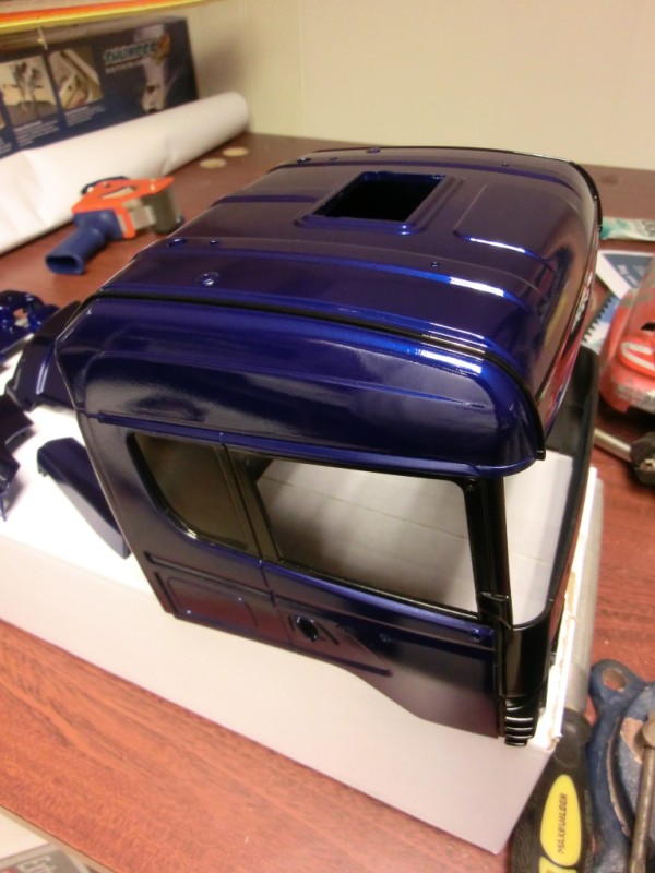 Nå er iallefall alt på førerhuset og sidedeksel ferdig lakkert blått og sort, og klarlakk gjenstår.