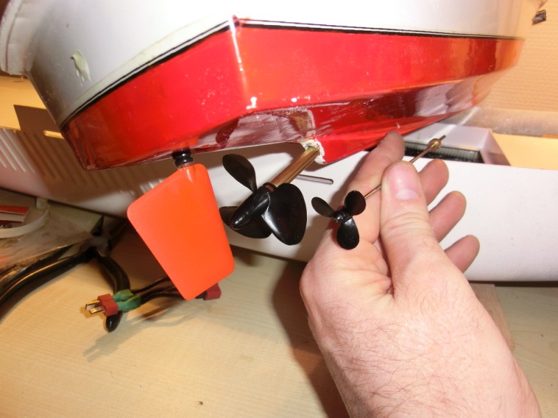 Har pågynt noen endringer på denne båten nå. Propell, aksel og motorkraft ble for smått når det ble båt å skubbe på, så jeg har nå fjerna den gamle akselen, borra ut akselhylsa, og tatt bort motoren. Jeg har også montert på et ror som samsvarer med den nye propellen, som mest sannsynlig blir 3-bladers M4 på 50mm. Dette pågrunn av at jeg har en del propeller i denne størrelsen, selv om den er i største laget til denne båten. Bedre skyv vil det gi uansett. Det vil også bli brukt Lithiumbatteri for vektbesparelse og effekt.