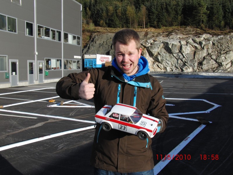 Ellers hadde eg, som i forrige runde, en smell i dag også.. Heldigvis var det under testinga av bana og eg brukte eit 7.2V nimh batteri.. Hadde eg køyrd med lipo spørs det om eg kunne køyrt løp i dag.. Då hadde det nok gått såpass fort at ting hadde gått mykje verre..Midt på langsida hadde vi lagt opp ei metallrist for å holde bana på plass.. Denne smalt eg sjølvsagt rett i.. Trudde med en gang eg hadde knekt ein bærearm, men var kun akselen som holdt bærearmen på plass som var slått laus.. Så det gjekk relativt kjapt å få fiksa..