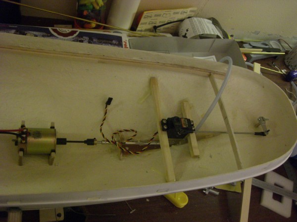 Har begynt på batterikasse som plasserast sentralt i båten. Rundt dette blir det plater med plass til mottaker og fartsregulator til framdriftsmotor. Motor er en Dumas 12V, denne skal ha et turtall på 5000 o/min ved 12V. Framdriftsbatteri blir bly, 12V 7Ah medan radiobatteri blir bly 6V, 4.3Ah. Motorkoblinga som følger med dumas-motoren har en mellomaksel/dogbone i plast, dette blei erstatta med et dogbone fra en TB02.