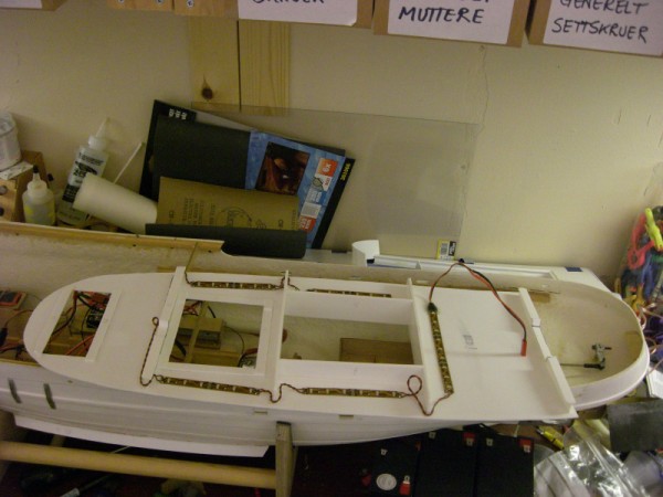 Change of plans...Eg blei grundig informert om at ingen modellbåt er komplett uten skikkelig ankerwinch. Dette blei forkynnt relativt seint på kvelden, på en av byggekveldane våre. Er ikkje heilt sikker på sannhetsgehalten i dette, men eg fant ut at det var ingen vei utenom. Dermed var det berre å begynne å bygge ankerwinch. Eg brukar samme patenten som Stressballen, berre i stereo. Mens Stressen bruker en liten microservo med metallgear, har eg brukt en vanlig futaba S148 servo. Denne var veldig enkel å bygge om til kontinuerlig drift, det var en liten medbringer under hoveddrevet som svinger potmeteret, denne var berre å plukke ut, så limte eg fast poten i midtstilling, dette gjorde eg mens servoen var tilkobla mottaker, for å få nøyaktig nullpunkt. Vurderte ei stund å ha winch på kun eit anker, men dette vart fort nedstemt. Eg utvikla då patenten med 2 separate tromler, der ein trommel kan holdast igjen mens den andre går. Dette fordi det eine ankeret kan bli winsja inn fortare enn det andre, og eg vil jo ikkje ha eit anker som henger halveis ute. Det ser ut til at denne patenten skal virke fint, men den har ikkje vært testa i båten med kjetting ennå. Har limt inn rør frå ankerklyssa og opp til dekk. Skal lime inn tilsvarande rør ned til winchen og, for å styre kjettingen, og for å ungå avsporing. Det blir 1m kjetting på kvar trommel. På grunn av winchen må eg flytte brytermodulen som i utgangspunktet var plassert framme i baugen. Denne vil bli plassert på babord side ved mottaker. Har fått laga til det elektriske anlegget med sikringer og brytere til belysning under dekk. Dette må dempast litt, til dette skal eg bruke 5-6 3amp dioder i serie, då får eg ned spenninga til ca. 8 volt. Eg føler det er greitt med sikringer ombord, i tilfelle kortslutning slepp ein i alle fall at skramlet brenn opp.... Har brukt vanlige blade fuses, flate bilsikringer. I går hadde Håvard fått i hus en del godis, i form av lydanlegg(lydmodul og brytermodul til sender) og utskytings leamikk til slepeline. Dette fekk fokuset vekk frå båtbygging ei stund, det er alltid festlig med tekniske dupedittar. Det var grom lyd fra denne modulen, men så er den veldig mucho monitas. Får sjå om det blir åpning i budsjettet til en slik. Vurderer i allefall å bygge inn høgtalar no, så er det klart til lyd på eit seinare tidspunkt.
