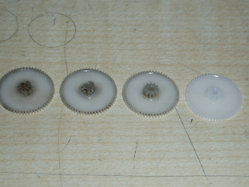EDIT: jeg slenger inn noen bilder av de ødelagte drevene her, og det ene bildet viser 1.tannhjul til alle tre cyclic-servoene. Til sammenligning er det et nytt 1.tannhjul helt til høyre. Tannhjul nr.2 fra høyre er helt, men litt slitt. Det andre bildet viser hele tannhjulsettet til futaba S9542.