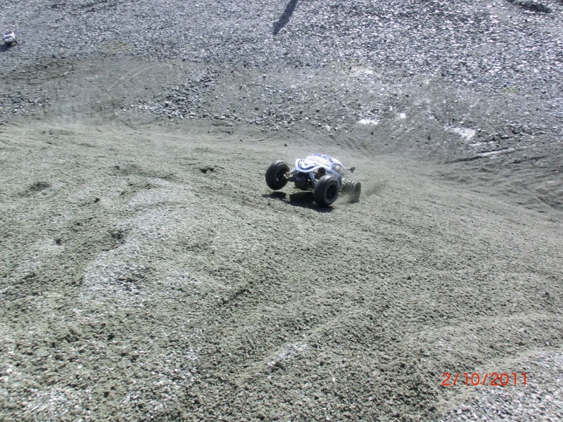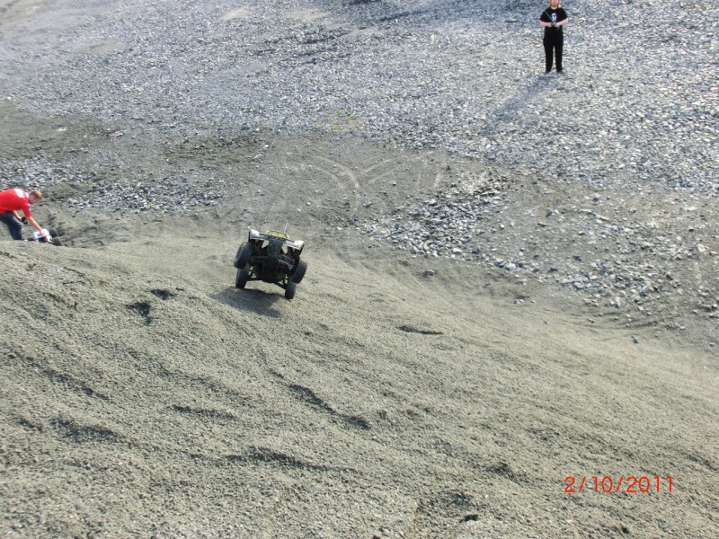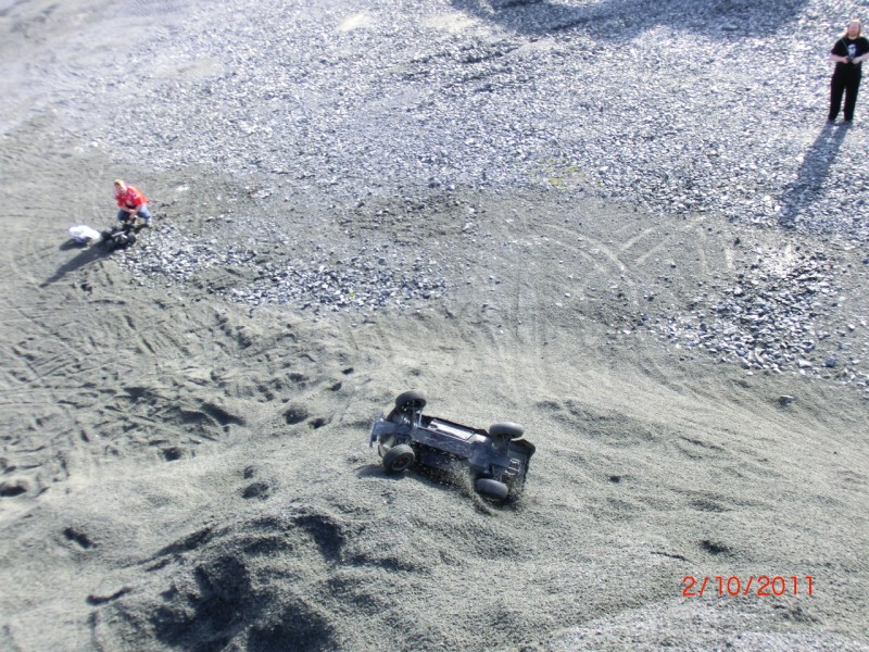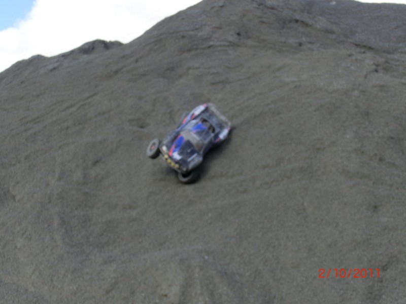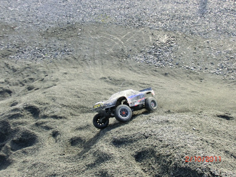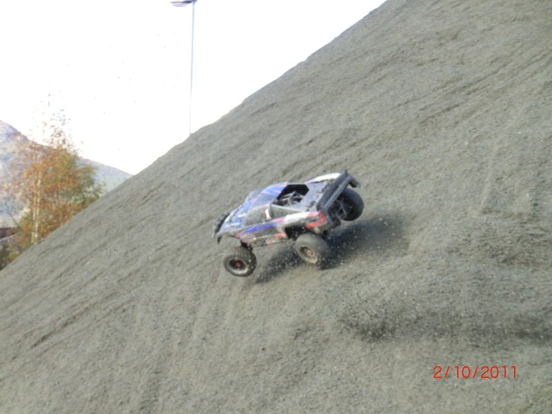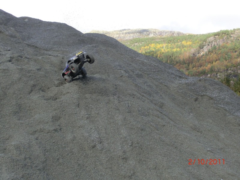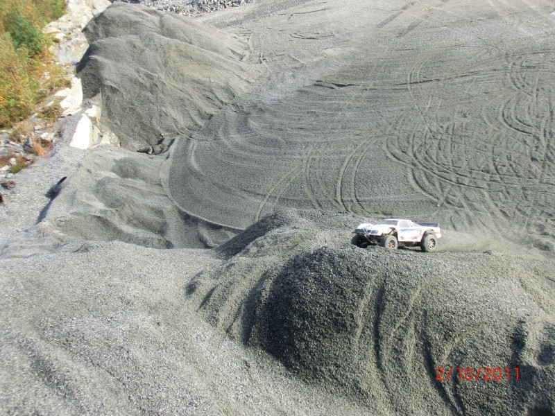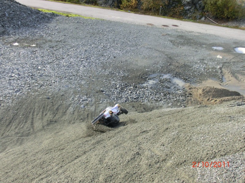 Så lenge grusen var nokon lunde hard hadde eg ingen peoblem å køyre rett opp sandhaugane utan noko særleg gass. Men etterkvart som padledekkene på bajane gravde opp grusen og det vart mjukare vart det verre utan at det vart noko problem av den grunn.. Problemet var nok at bilen fikk litt for mykje vekt på bakhjula som førte til at frammdekkene løfta seg, fikk mindre kontakt med grusen, blei til pizzahjul som då igjen førte til at kreftene i bilen forsvann i hjulspinn :p stressballen meinte at ein tjukkare diffolje i midtdiffen kanskje kunne gjøre susen, så kanskje eg må skru litt til neste gang ;)