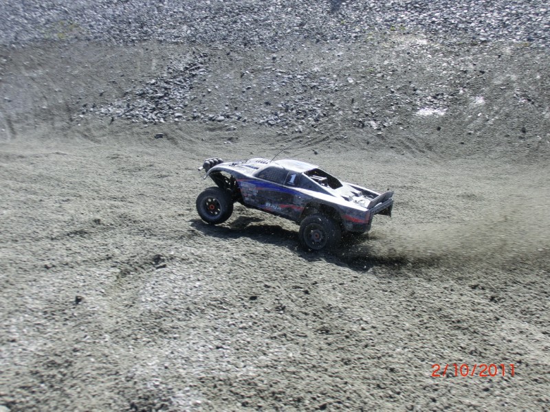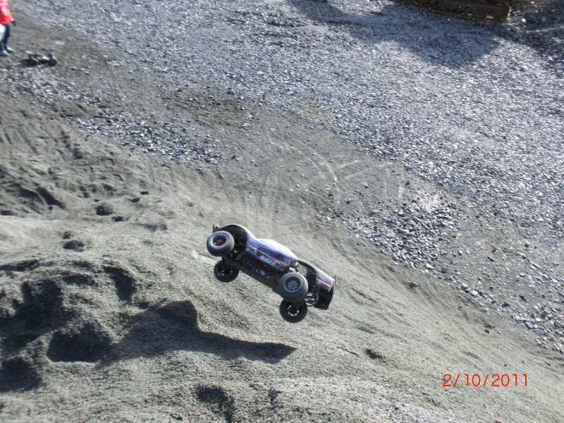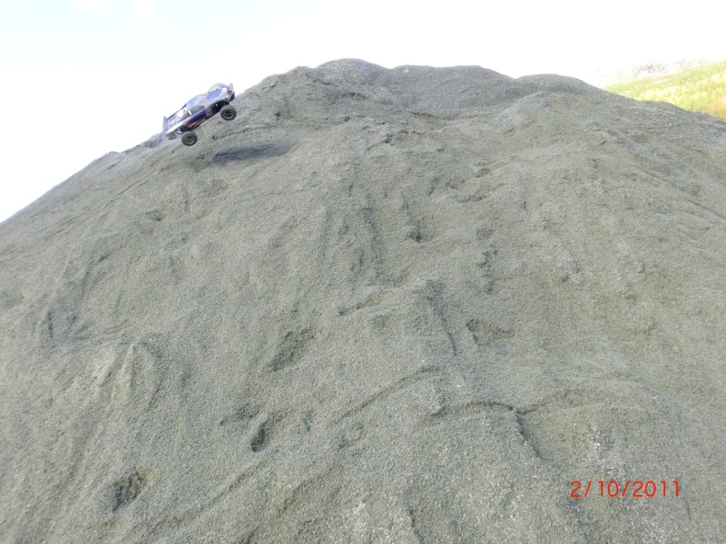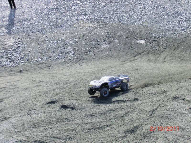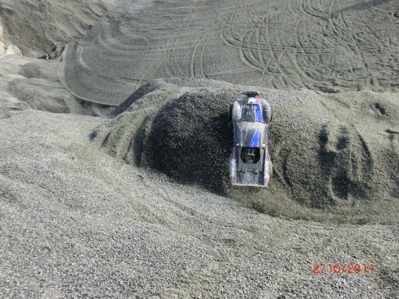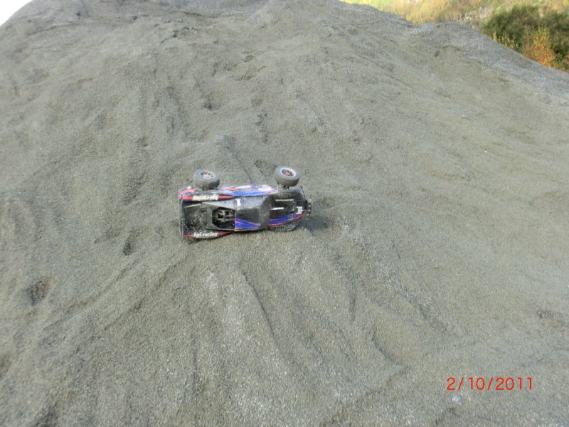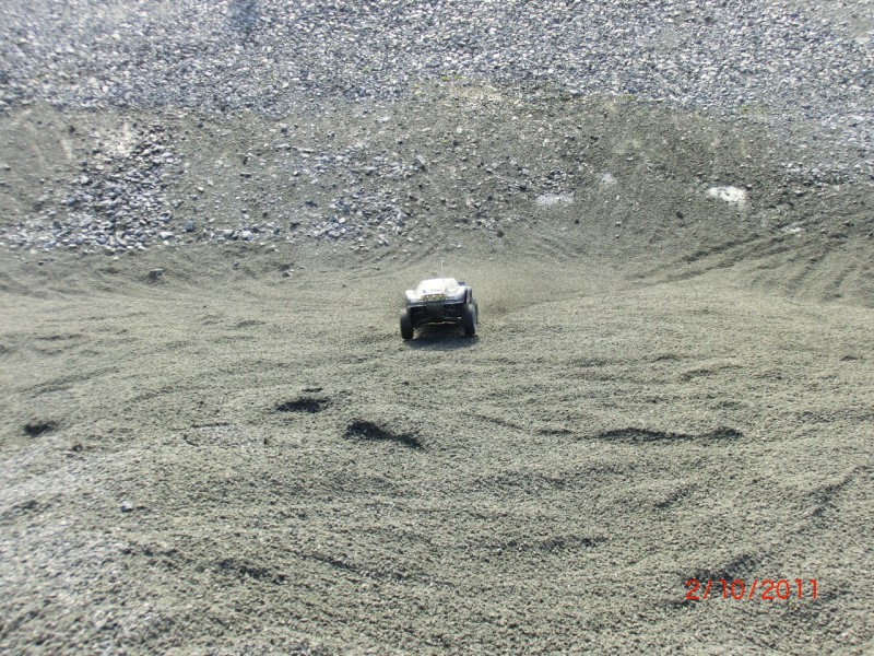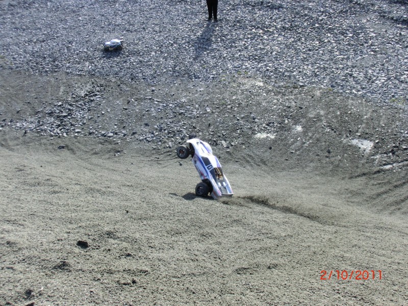 Så lenge grusen var nokon lunde hard hadde eg ingen peoblem å køyre rett opp sandhaugane utan noko særleg gass. Men etterkvart som padledekkene på bajane gravde opp grusen og det vart mjukare vart det verre utan at det vart noko problem av den grunn.. Problemet var nok at bilen fikk litt for mykje vekt på bakhjula som førte til at frammdekkene løfta seg, fikk mindre kontakt med grusen, blei til pizzahjul som då igjen førte til at kreftene i bilen forsvann i hjulspinn :p stressballen meinte at ein tjukkare diffolje i midtdiffen kanskje kunne gjøre susen, så kanskje eg må skru litt til neste gang ;)