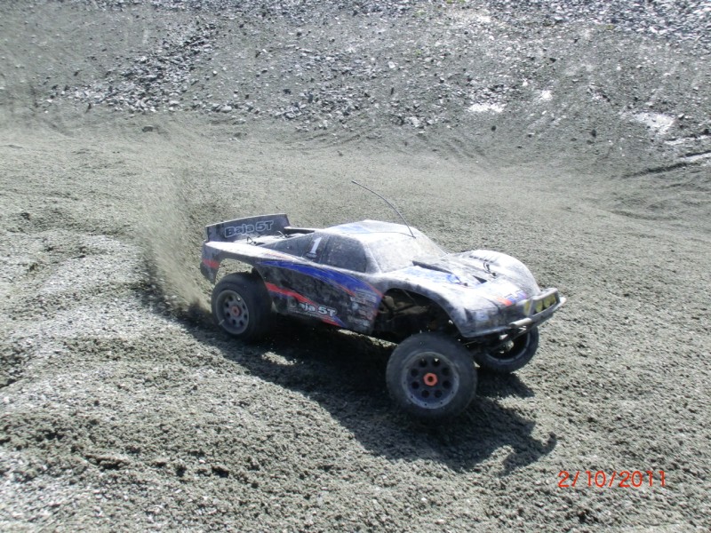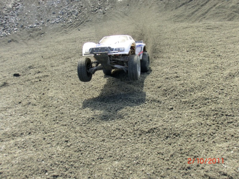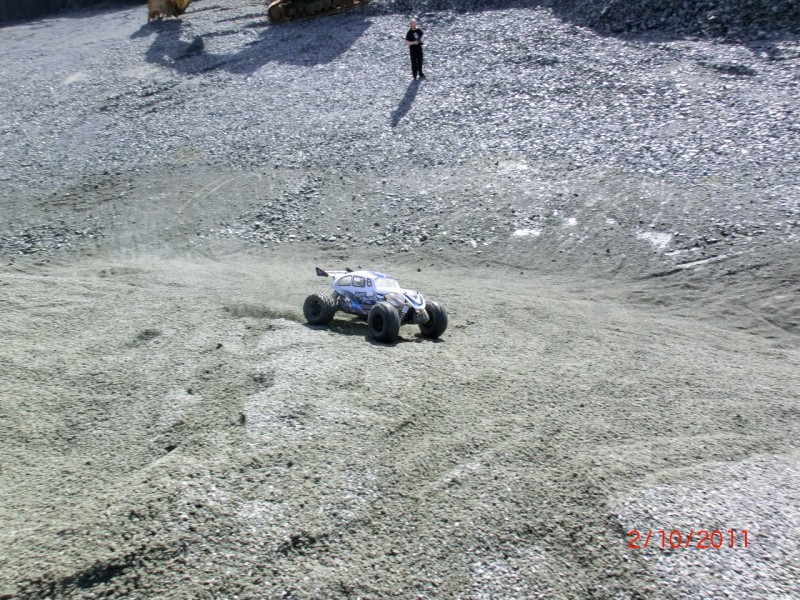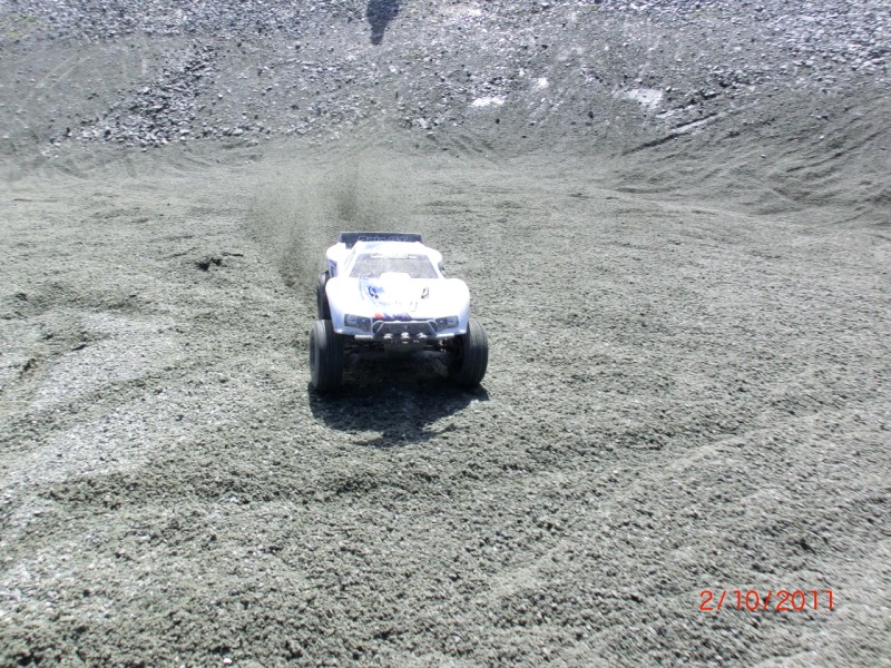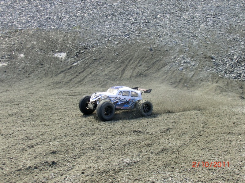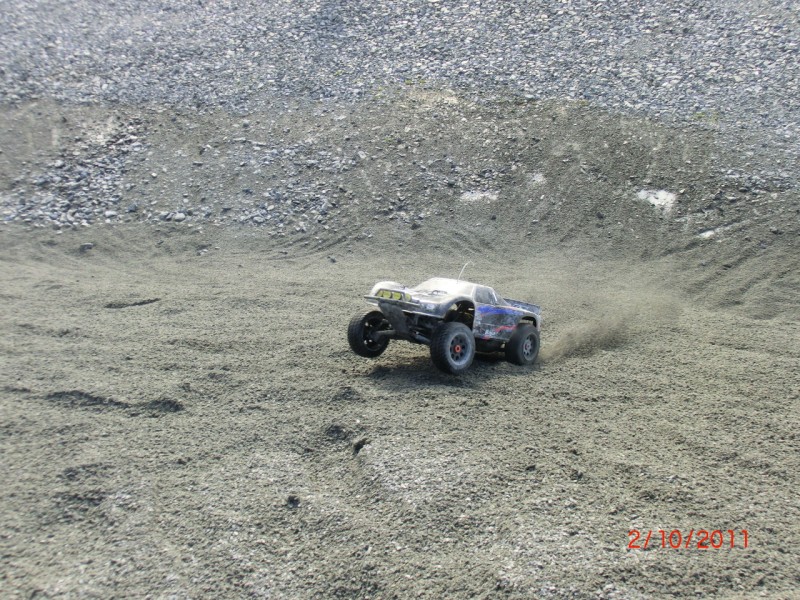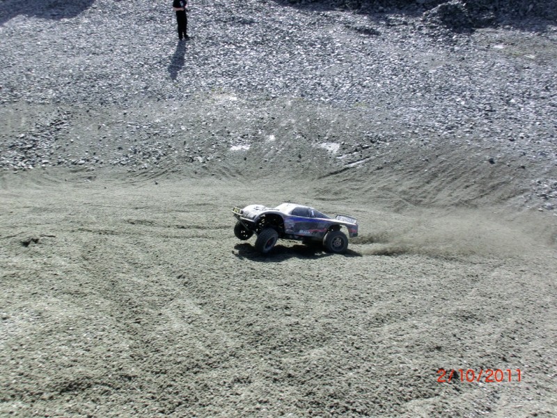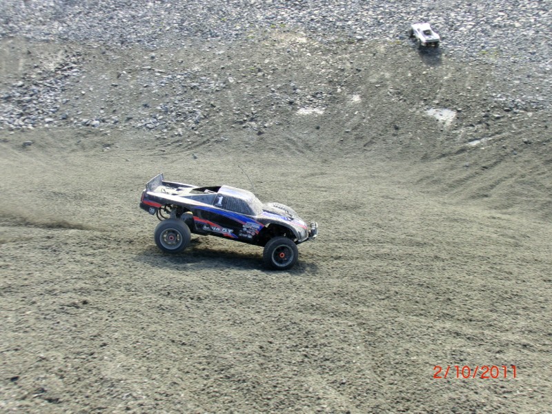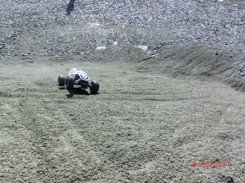 Så lenge grusen var nokon lunde hard hadde eg ingen peoblem å køyre rett opp sandhaugane utan noko særleg gass. Men etterkvart som padledekkene på bajane gravde opp grusen og det vart mjukare vart det verre utan at det vart noko problem av den grunn.. Problemet var nok at bilen fikk litt for mykje vekt på bakhjula som førte til at frammdekkene løfta seg, fikk mindre kontakt med grusen, blei til pizzahjul som då igjen førte til at kreftene i bilen forsvann i hjulspinn :p stressballen meinte at ein tjukkare diffolje i midtdiffen kanskje kunne gjøre susen, så kanskje eg må skru litt til neste gang ;)