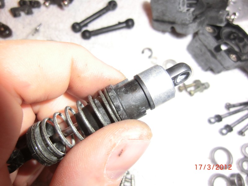 De har forøvrig en fin patent på justering av fjæra, istedenfor mutter eller klips for å stramme fjæren på støtdemperen, så har de en spacer med spor i forskjellige lengder. Ved å sette denne spaceren i forskjellige spor, så kan en justere fjærstyrken i 6 trinn. Ganske fin patent egentlig, siden det er mulig å ta veldig hurtige justeringer. En slipper å skru seg i hel på en mutter, og en slipper å drasse på støtdemperklips. Har inntrykk av at Kyosho prøvde å få til en morsom bil med smarte løsninger og enkel oppbygging, og det har de fått til.