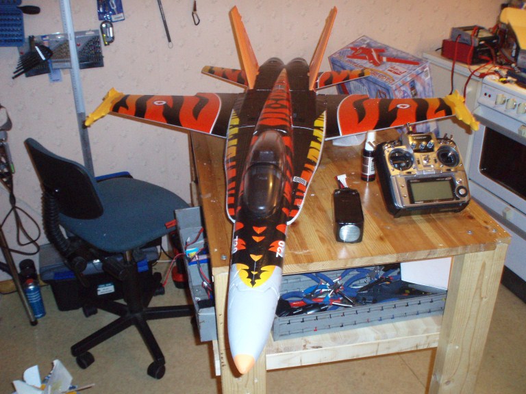 Eg skal skrive litt mer når eg har satt den skikkeleg isammen. Ikke helt klar. 90mm vifte. 100A regulator og 6 sells 3700mAh lipo. Det blåser noe så inni helvete av den vifta at en MÅ oppleve det. Gleder meg stort til å prøve det ut. Nå har eg 3 speed modeller, men er usikker på kem eg liker best av F 18 og mustangen. 2 vidt forskjellige fly er det jo da. Håper på å ta opp kampen om speed tittelen nå!