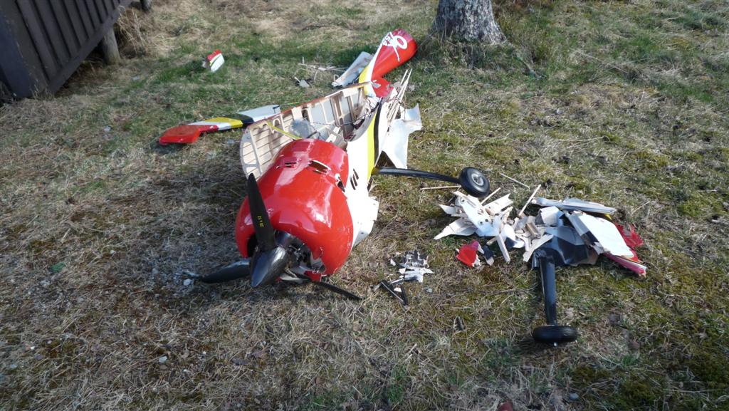 Flyet er totalt knust, det eneste som jeg kunne se var helt er halehjulet. Vingerøret var faktisk knekt det også, stabrøret bøyd så det har vært en skikkelig smell.