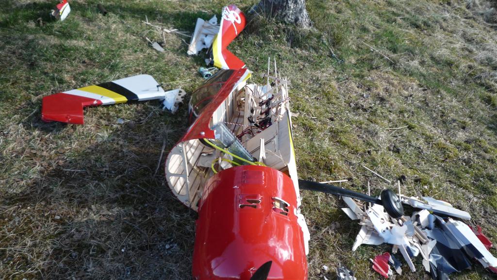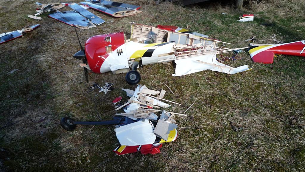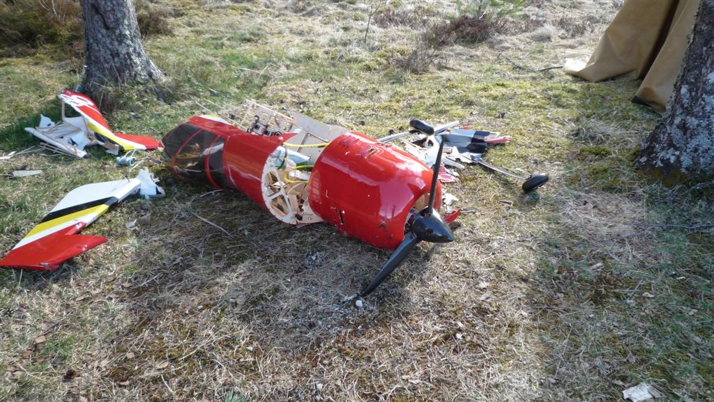 Flyet er totalt knust, det eneste som jeg kunne se var helt er halehjulet. Vingerøret var faktisk knekt det også, stabrøret bøyd så det har vært en skikkelig smell.