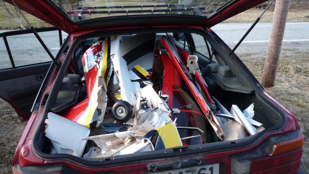 Flyet er totalt knust, det eneste som jeg kunne se var helt er halehjulet. Vingerøret var faktisk knekt det også, stabrøret bøyd så det har vært en skikkelig smell.