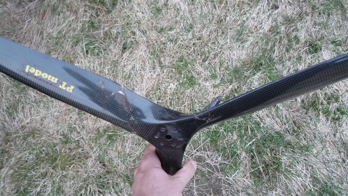 Propellen hadde skade på to blader, spinneren klarte seg nesten men er ødelagt den også. Imsdalflaska er temmelig deformert men er fremdelse tett, funka fint som bensintank.