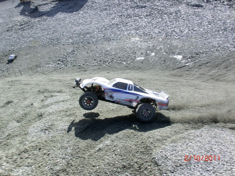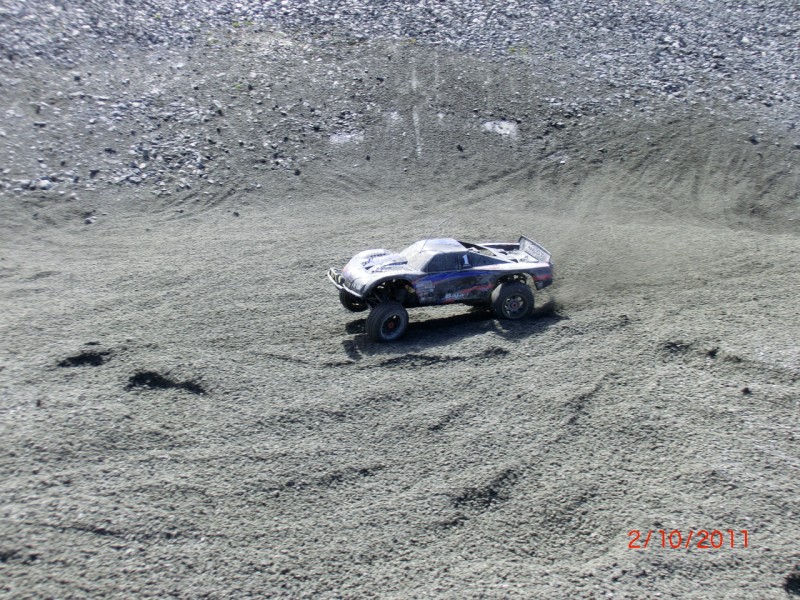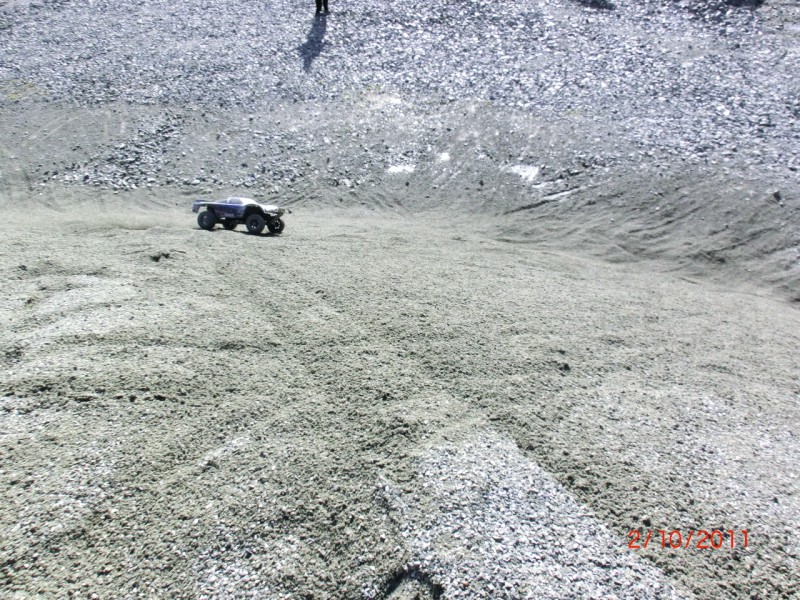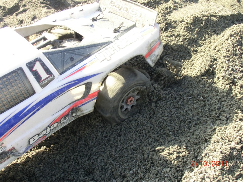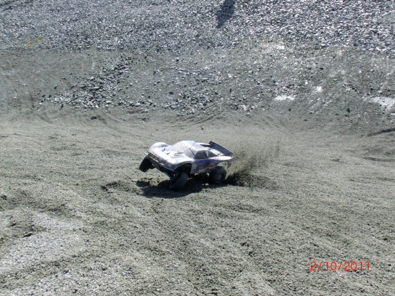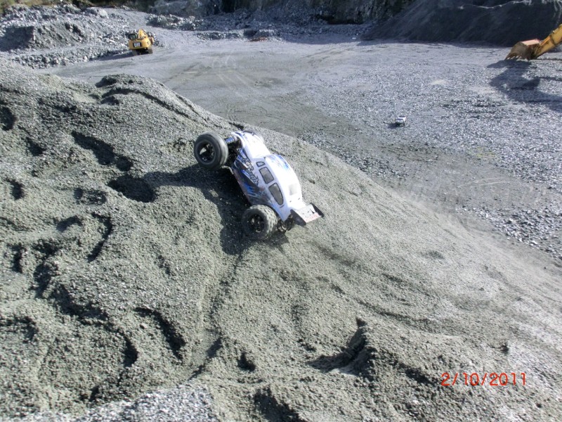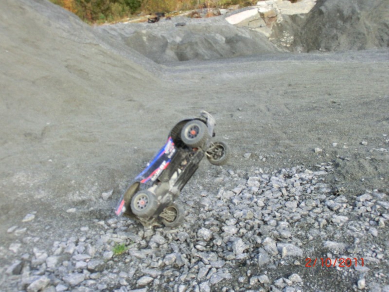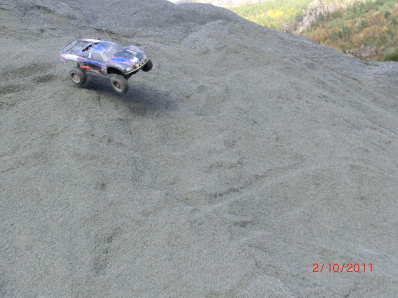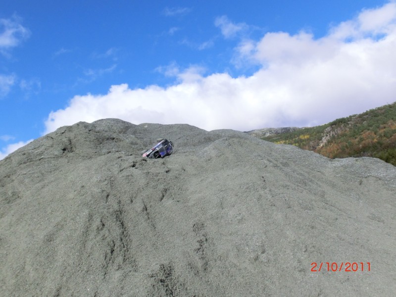 Så lenge grusen var nokon lunde hard hadde eg ingen peoblem å køyre rett opp sandhaugane utan noko særleg gass. Men etterkvart som padledekkene på bajane gravde opp grusen og det vart mjukare vart det verre utan at det vart noko problem av den grunn.. Problemet var nok at bilen fikk litt for mykje vekt på bakhjula som førte til at frammdekkene løfta seg, fikk mindre kontakt med grusen, blei til pizzahjul som då igjen førte til at kreftene i bilen forsvann i hjulspinn :p stressballen meinte at ein tjukkare diffolje i midtdiffen kanskje kunne gjøre susen, så kanskje eg må skru litt til neste gang ;)