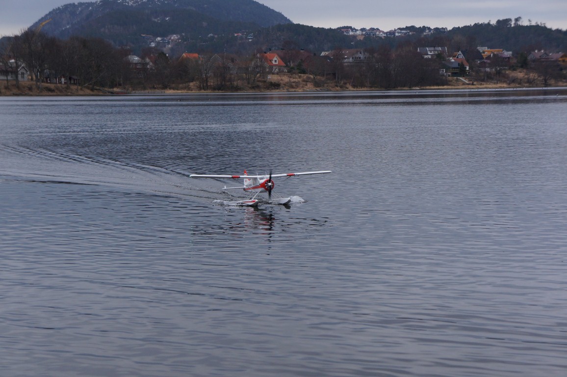 Flyet ser meget fint ut, har godt med lys og fungerende flaps. Jeg har satt opp flapsen i 2 trinn, og satser på å få mikset inn litt elevator etterhvert også. Må nesten prøve meg litt frem på forholdene der, med tanke på hvor mye utslag som skal justeres. Jeg har også valgt å bygge flyet med flottører, da jeg hovedsaklig vil ha denne til bruk på storevannet. Jeg hadde jomfrutur på storevannet etter halltreffet på lørdag, og det gikk veldig greit, til tross for 6 unger rundt beina som spurte om alt, og som skulle stå oppå fjernkontrollen når jeg hadde flyet i lufta (3 av barna var heldigvis mine egne :D ). Det var dessverre ikke så veldig stabile vindforhold, så jeg prøvde ikke flaps, roll eller slikt. Jeg følte meg litt frem på en påbegynt roll, men den virket tung, så jeg avbrøt umiddelbart. Tok noen looper, men ellers var det bare flyving i sirkler og åttetall, pluss noen takeoffs og landinger. Flottører av denne størrelsen gjør ganske mye med flyets egenskaper i lufta, så det er fort gjort å tro at det har bedre egenskaper enn det virkelig har. Liker ikke å prøve ut så mye når jeg må være litt på hugget i forhold til vind, og spesielt siden jeg tar jomfruturen så nært byen. Flyet har godt med power, og det er ikke vanskelig å ta av, eller å lande for den saks skyld. Jeg ser frem til noen fine kvelder på storevannet med dette flyet :D
