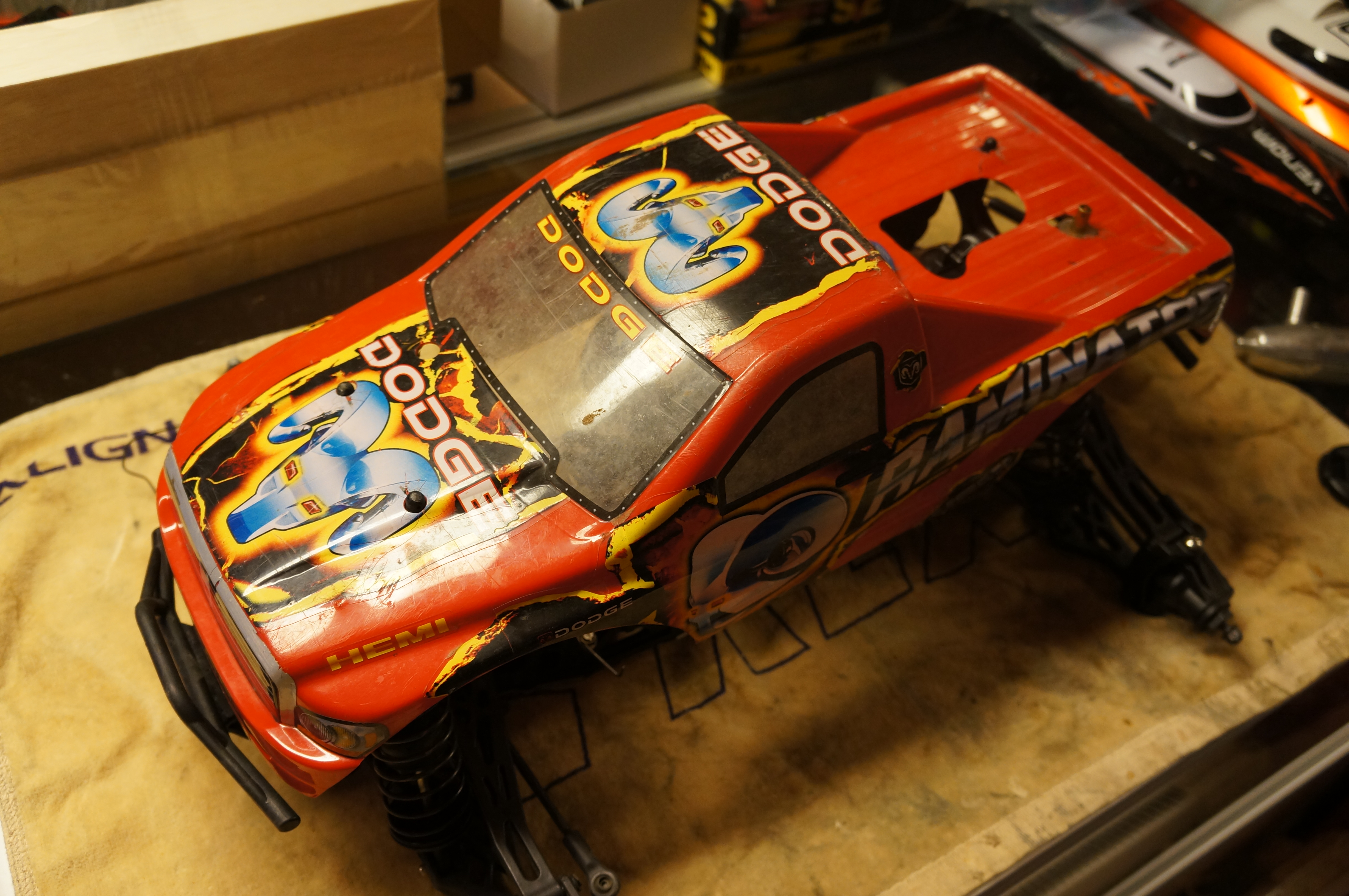 Hva som beholdes av elektronikk er jeg ikke sikker på enda. Nåværende servo som står på gass/brems blir nok flytta til å håndtere girskifte, og så putter jeg en vanntett Hitec eller Savox på gass/brems. Jeg synes det er litt viktig å ha akkurat den servoen oppdatert, det dreier seg jo tross alt om å stoppe en tung nitrobil :)