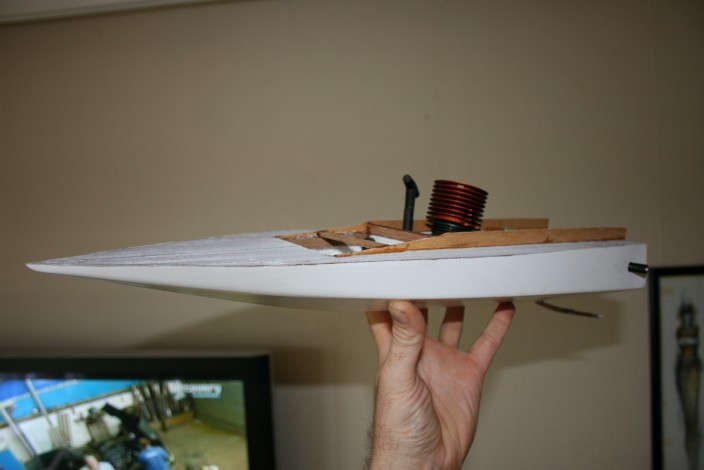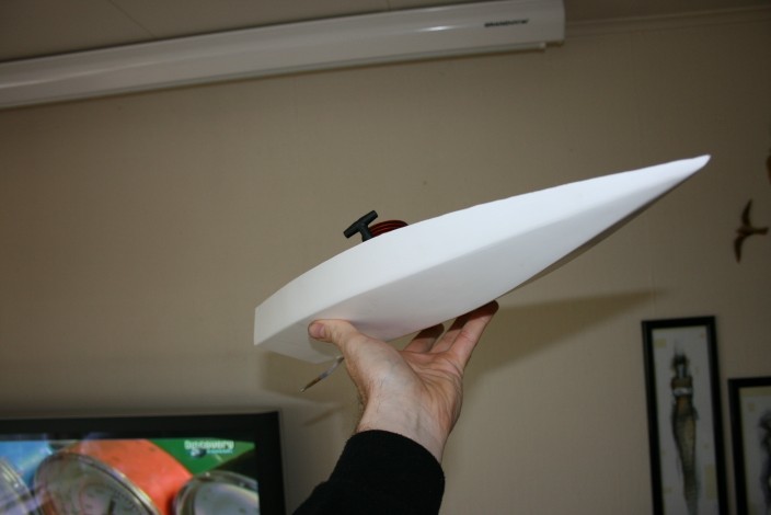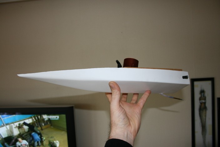 Hehe, feeeet liten sak :D Denne må jo bare bli rå på vannet :) Hvordan blir tyngdepunktet med den motoren der? Litt høyt kanskje?