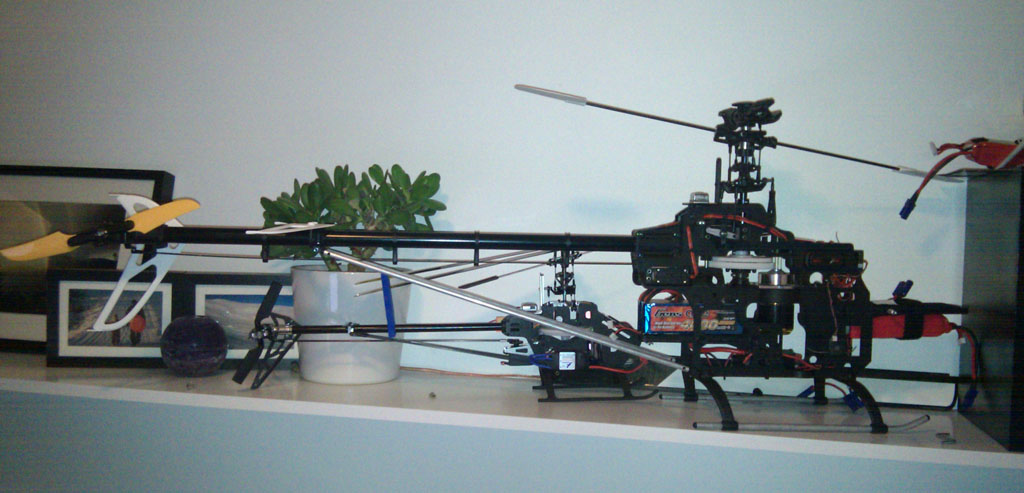 Jeg har forøvrig gått over til å henge helikopterene mine på veggen med halen ned kontra det å sette dem på hyller. Det tar mindre plass, selv om de gjerne stikker litt mer ut fra veggen. Jeg har bare laget en hyllekant på 2-3cm med en stoppelist på, og så står bakre del av understellet på denne kanten.