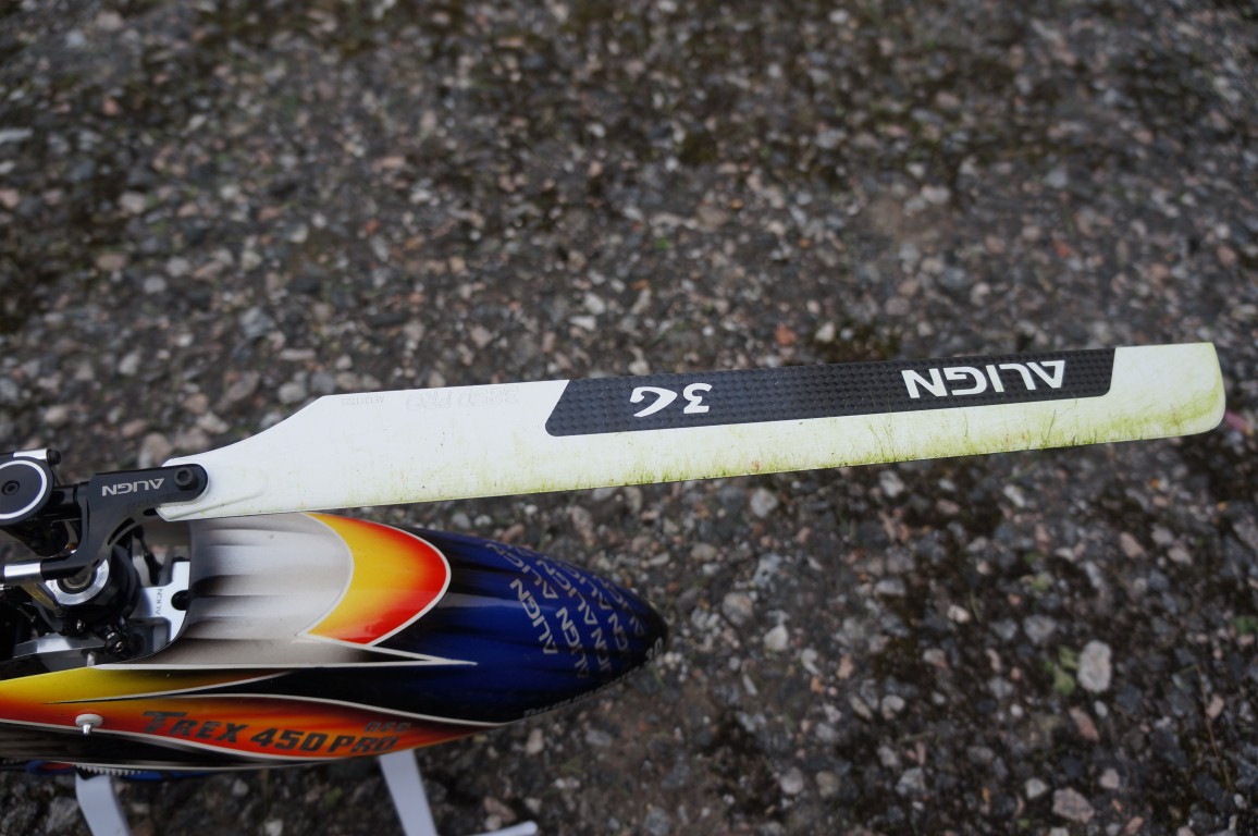 Tok jomfruturen på denne i helga, og det gikk knirkefritt for seg. Vil øke opp noen parameter på 7200BX for å gjøre helikopteret litt kvikkere, men det var veldig stabilt og fint å fly. Må ha noen pakker til før jeg sitter med alle inntrykkene, men i utgangspunktet er jeg godt fornøyd med hvordan helikopteret føltes ut i lufta. Følte at det var obligatorisk å la helikopteret spise gress på første turen, dette helikopteret skal brukes. De beste bildene ble dessverre uklare, men helikopteret spiste så mye gress at det begynte å wobble etter at turtallet sank drastisk. Men det holdt heldigvis med motorkrafta. Rotorbladene er grønne inn til rota, og drevene i halekassa var grønne også, så helikopteret fikk sin del og litt til av moder natur. Det var iallefall veldig kjekt å fly Trex 450 igjen, og ha et helikopter man ikke trenger å være redd for på noen måte :D